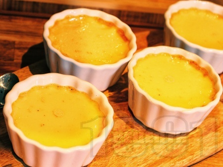 Фурната се загрява на 170 градуса и купичките с крема се поставят в метална тава, в която има 2-3 пръста вода....Купичките се поставят отново във фурната, но се пекат само на горен реотан при най-висока температура за няколко минути, докато захарта се разтопи и карамелизира.