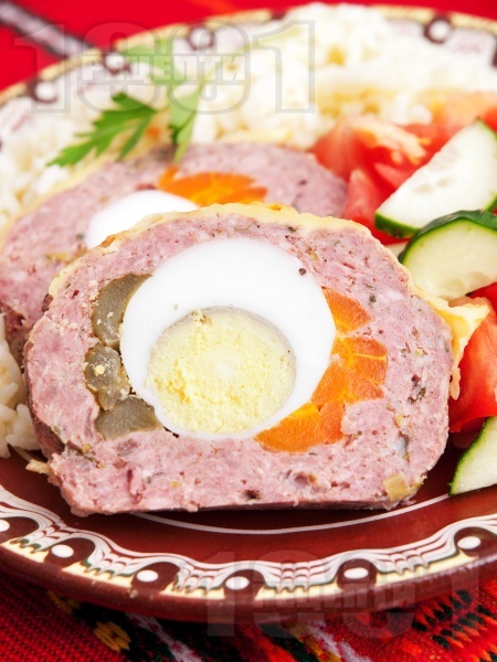 Рецепта:Яйцата (3 бр) и морковът (1 бр) се сваряват. Оставят се настрани. Двата вида кайма се омесват и към тях се прибавят ситно нарязаният лук (1 глава), суровото яйце (1 бр) и подправките - кимион (1 ч.л.) и черен пипер (1 ч.л.). Завива се с фолио и се оставя в хладилник за поне час, за да се смесят ароматите. След това каймата се разстила върху фолио, като целта е да се получи правоъгълен пласт кайма с височина не повече от сантиметър и половина. Сварените яйца, морковът и нарязаните на ивици кисели краставички се нареждат върху подложката от кайма. Увива се и се поставя в намазана с олио тавичка. Завива се с фолио и се поставя в загрята до 190 градуса фурна. Пече около час, като през първата половина се пече с фолио, а след това то се отстранява. Малко преди рулото да е готово, се поръсва с настърган кашкавал и се връща във фурната, за да може да се разтопи. |