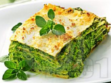 Рецепта:Брашното (1 с.л.) се запържва за около 1 минута в масло до златисто. Налива се студена вода или студен зеленчуков бульон (600 мл.) и с постоянно разбъркване се изчаква сосът да кипне. Ситно нарязаният чесън (3 скилидки) се запържва до златисто в силно загрят зехтин (3 с.л.). Прибавят се нарязаният праз (2 стръка) и настърганият морков (1 бр). Подправя се с риган. Щом зеленчуците омекнат, съдът се снема от котлона. Спанакът (1 кг) се измива, нарязва и бланшира. Дълбока правоъгълна тава се намазва с олио или зехтин и се налива един черпак от соса, за да покрие дъното. Слагат се ред кори за лазаня, предварително бланширани в подсолена вряща вода, ред спанак и извара. Продуктите се разпределят равномерно и отгоре се натрошава сирене. Поставя се втори ред кори, като леко се притискат, за да се изравни плънката. Върху тях се редуват спанак, извара и сирене. Третият ред кори се залива с останалия зеленчуков сос. Пече се 30 минути във фурна на 200 градуса. След това се поръсва обилно с настърган кашкавал (200 г), риган, босилек и червен пипер. Лазанята се допича до златисто. Нарязва се на порции и се поднася със зелена салата и червено вино. |