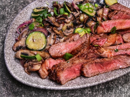 РЕВОЛЮЦИЯ В КУХНЯТА - Сочен Рибай стек с гарнитура от печурки, тиквичка и червен лук в лек сметанов сос
