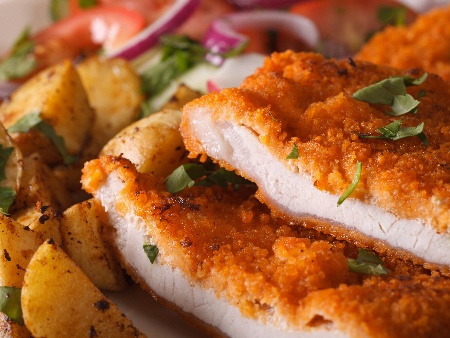Сочни свински шницели от филе (карета, пържоли) панирани в яйца и галета печени на фурна