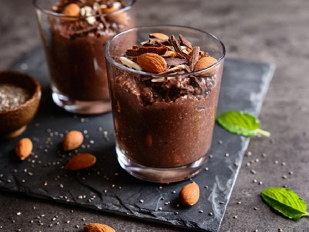 Крем пудинг с авокадо, чия, какао, соево мляко и бадеми