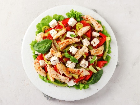 Салата с пилешко филе, булгур, чушки, маслини и сирене