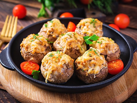 Пълнени гъби печурки с бекон, крема сирене и кашкавал печени на фурна