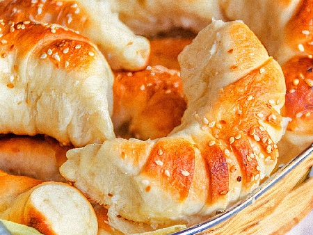 Продукти:Рецепта:Маята се разтваря в прясното мляко заедно със захарта и 2 лъжици брашно. Оставя се да се активира за 10 минути. След това се добавят олиото, сол, бакпулвер и разбитите белтъци на яйцата. На части се слага брашното, докато се омеси меко нелепнещо тесто. Оставя се да втаса за 1 час. Тестото се разделя на 2 части и всяка се разточва на кора. Нарязват се на триъгълници. В широката част на всеки триъгълник се натрошено сирене. Навиват се кифли и се нареждат в тава, покрита с хартия за печене. Намазват се с разбит жълтък и масло и се поръсват със сусам. Кифлите се оставят да втасат за около 30 минути. След това се пекат за 20 минути в загрята фурна на 200 градуса. |
