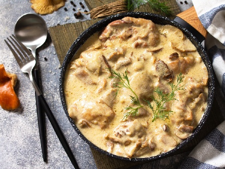 Бързи задушени пилешки хапки от филе с гъби, течна готварска сметана и и копър на тиган