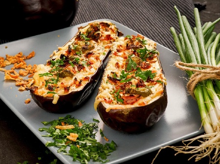 Пълнени патладжани с наденица и моцарела
