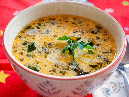 Рецепта:Агнешкото месо, морковите, пащърнака и целината се нарязват на кубчета. Задушават се в загрята масло и се поръсват с накълцан магданоз. Наливат се водата и квасът и супата се посолява на вкус. Оставя се да заври, след което къкри около 20 минути. Слага се останалото масло. Брашното се запържва за кратко и към него се добавят 2 черпака бульон. След това сместа се връща в супата и се оставя да заври. Къкри на по-слаба температура, докато се сгъсти и се подправя със сол и черен пипер. Заквасената сметана се разбърква с жълтъците. Супата се сваля от котлона и се застройва. Подправя се на вкус с лимонов сок и се сервира гореща. |