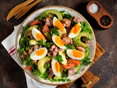 Зелена салата с пушена скумрия, авокадо, варени яйца и меден дресинг