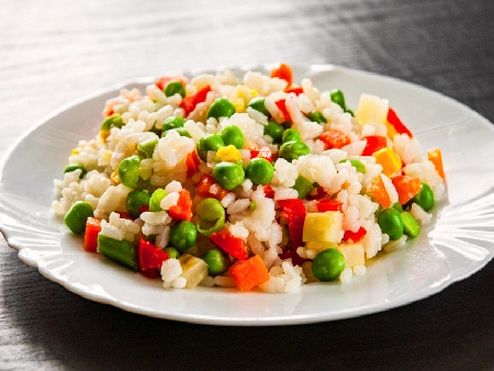 Гарнитура от ориз със зеленчуци - грах, моркови и чушки