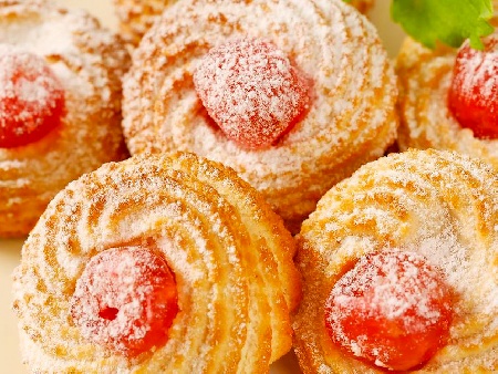 Рецепта:С електрически миксер разбийте заедно маслото и захарта. Добавете яйцето. Разбийте добре. Добавете брашното, бакпулвер, сол и ванилия. Смесете добре. Тестото се прехвърля в пош със звездовиден накрайник. Върху тава, покрита с хартия за печене, се оформят сладките. В центъра на всяка се слага по една черешка. Печете в предварително загрята 180 градуса фурна за около 8 до 9 минути. Изваждат се, поръсват се с пудра захар и се оставят да изстинат. |