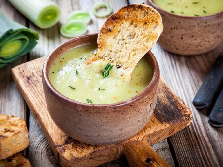 Рецепта:В тенджера на среден огън за разтопява маслото. Добавя се нарязания праз и се готви, като периодично се разбърква, за около 10 минути или докато омекне. Слага се брашното и се разбърква. След около минута, при непрекъснато бъркане, се наливат бульона и 1 чаша вода. Супата се оставя да заври, след което температурата на котлона се намаля на ниска и се оставя да къкри за около 10 минути. Подправя се с естрагон. Супата се сваля от котлона, пасира се и се подправя със сол и черен пипер на вкус. |