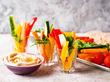 Рецепта:В купата на кухненски робот или чопър се слагат таханът и лимоновият сок и се смилат за около минута. Това допълнително разбива тахана, като прави хумусът по-гладък и кремообразен. Към тази смес се добавят зехтин, смлян чесън, кимион и сол. Отново се смила за 30 минути и се добавя отцеденият и изплакнат нахут. Може да има нужда и да се добави на части. Хумусът се смила за около една до две минути или докато стане с гладка консистенция. Ако стане прекалено гъст, се добавят две до три лъжици вода, докато се достигне идеалната консистенция. Посолява се на вкус и се прехвърля в купичка. Поръсва се с пушен червен пипер и струйка зехтин. Към него в купички или високи чаши се гарнират различни зеленчуци - нарязани на ивици моркови, краставички и целина. |