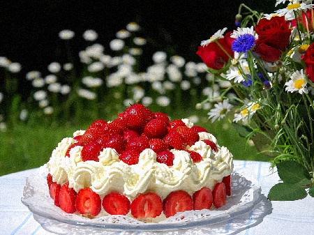 Рецепта:Заквасената сметана се разбърква със семенцата от разполовената шушулка ванилия. Добавят се накълцаният босилек и кондензираното мляко. Половината от ягодите се нарязват на дребни кубчета. Козунакът се нарязва на еднакви по дебелина филии. Дъното и стените на форма спадащо дъно се намазват с олио и се покриват с хартия за печене. Около 1/3 от козунака се подрежда на дъното на формата, отгоре се слагат половината нарязани ягоди и върху тях една трета от крема. След това отново се нареждат в същата последователност - козунак, ягоди и крем. Когато продуктите се изчерпят, цялата торта се намазва с крем, но трябва да остане малка част и за стените. Тортата се оставя в хладилника за една вечер. След това се изважда от формата и се донамазва с останалия крем. Украсява се с останалите ягоди и по желание могат да се поставят няколко листенца босилек за още по-свеж вид. |