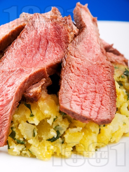Рецепта:Телешкото месо (400 г) се запържва в не много нагорещен тиган по 5-6 минути от двете страни. При обръщането не трябва да се използва вилица или нож, за да се запазят соковете. Трябва да се образува тъмна коричка. Когато е готово се поставя в предварително загрята до 200 градуса фурна. Пече се 20, 30 или 40 минути в зависимост от предпочитанието (на снимката е печено 30 минути). Картофите (1/2 кг) се сваряват, обелват и нарязват на малки кубчета. След това се запържват с нагорещения зехтин (4 с.л.) заедно с нарязания на ситно босилек (1 стрък) за 5-6 минути. Месото се нарязва на филийки и се поставя върху пирамида от картофите. |