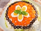 Изварена салата / разядка с чесън, майонеза, грах, царевица и сусам