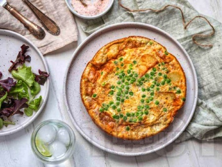 Фритата с пресни картофи, яйца, грах и козе сирене