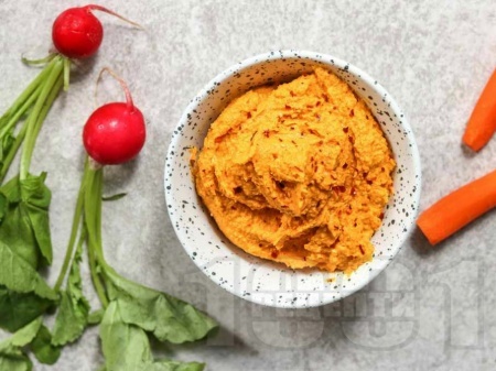 Рецепта:Сладкият картоф (2 бр) се обелва и се нарязва на кубчета. Сварява се във вряща подсолена вода за около 10 минути. След това се отцежда и се слага във висока купа. Добавят се нахутът (150 г), лютата чушка (1/2 бр) и гарам масала (1 ч.л.). Продуктите се пасират до гладка хомогенна смес наподобяваща пастет. Разядката се подправя със сол и черен пипер и се поднася с препечи филии или крекери. |