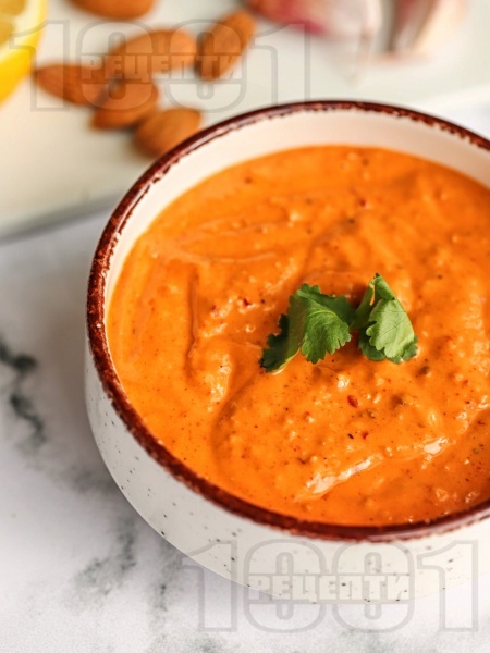 Рецепта:Фурната се загрява на 250 градуса. Тава се покрива с лист алуминиево фолио и червените чушки (2 бр) се запичат за около 20 минути. След това се изважда и се увиват във фолиото. Оставя се да престоят така няколко минути. Бадемите (4 с.л.) се запичат на сух тиган до лек загар за около 5 минути. Чушките се обелват и се смилат в блендер или кухненски робот. Добавят се бадемите, зехтин (2 с.л.), лимонов сок (2 с.л.), сол и чили на вкус. Сместа отново се смила до хомогенност. Оставя се да се охлади и се съхранява в кутия в хладилника до седмица. |