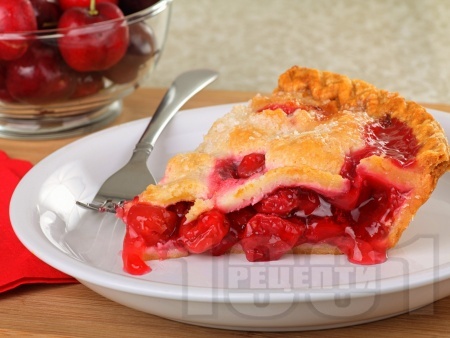 Рецепта:Приготвя се основата на пая, като брашното (2 ч.ч.) се пресява със сол. Добавят се студената свинската мас (180 г) и маслото (2 с.л.) и тестото се претрива с ръце. При нужда се налива малко студена вода. Оформя се на топка и се оставя да стегне в хладилника за поне 1 час След това се разделят на 2 части, като едната е по-голяма, и се разточват на кори. Едната се слага във формата, другата се отделя за горната част на пая. Черешите (4 1/2 ч.ч.) се почистват от костилките и се разбъркват със захар (1 ч.ч.), нишесте (1 1/2 ч.л.), сол и бадемов екстракт. Черешовата смес се изсипва върху блата и отгоре се слага другата част от тестото. Краищата се запечатват добре. Прясното мляко (1 с.л.) и захарта (1 с.л.) се разбърква и паят се намазва със сместа. Правят се отвори отгоре, за да излиза парата. Паят се пече в загрята фурна на 200 градуса за около 35-40 минути. |