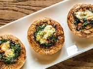 Печени пълнени гъби с три вида сирене (гауда, моцарела, пармезан), галета и спанак на фурна |
