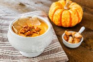 Супа от тиква с горски гъби, заквасена сметана и сирене ПекориноСлед това се пасира и се прецежда. |