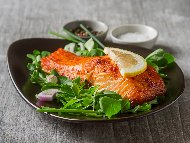 Печено филе от риба сьомга на тиган с лимон и ароматни подправкиДобавя се сокът от половин лимон, настъргана кора от половин лимон и лимонови резенчета. |