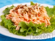Салата от моркови, портокал, орехи и майонезаСалатата се овкусява с майонезата, лимоновия сок и солта. |