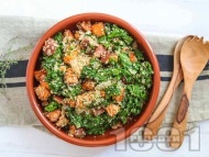 Салата от печени сладки картофи, кейл, киноа и дресингСалатата се подправя с балсамов оцет, зехтин, мащерка, сол и черен пипер на вкус. |