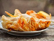 Сладка баница от готови кори с плънка от тиква, канела, орехи и ванилияДве по две кори се намазват с олио и се наръсват с тиквената плънка, след което се навиват на рула. |