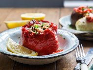 Пълнени чушки с коприва, ориз, яйца и доматено пюреТази смес се разбърква добре и с нея се пълнят предварително попарените сухи червени чушки. |