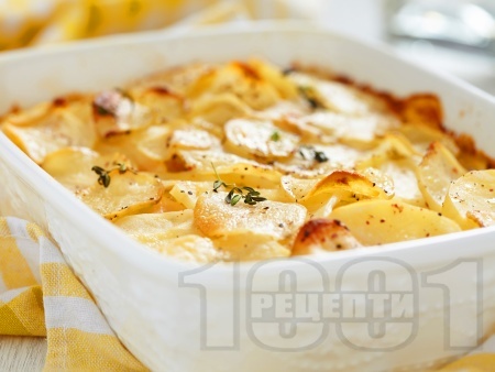 Картофи огретен със сурови картофи без варене, течна сметана и билки - розмарин, риган, мащерка на фурна