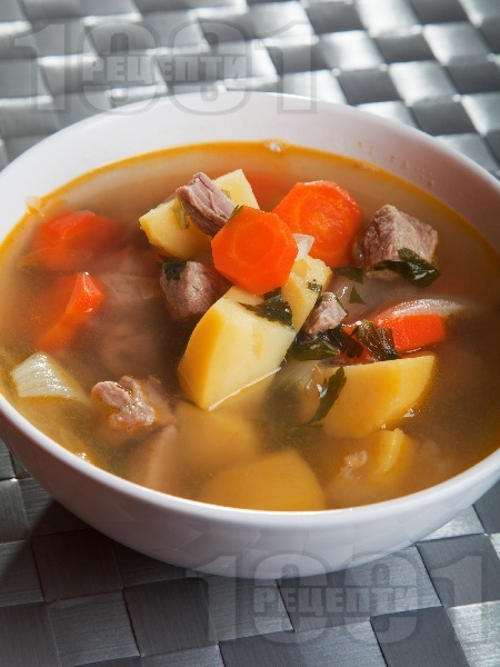 Супа с телешко месо, ечемик и зеленчуциНарязаното на хапки телешко месо се запържва от всички страни, докато покафенее....Супата се похлупва и се оставя да къкри около час и половина или докато месото омекна. |