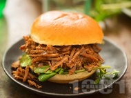 Сандвичи с дърпано телешко и сос с кетчуп, горчица и сос УорчестърТелешкото месо се нарязва на парчета и се запържва в загрята мазнина. |