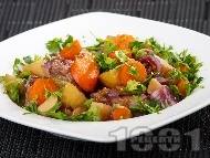 Яхния с телешко варено-задушено месо, картофи и морковиЯхнията се оставя да ври за около половин час или до готовност на картофите. |