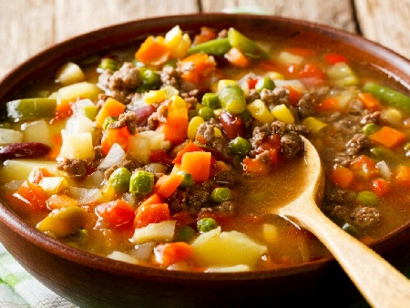 Пикантна зеленчукова телешка супа с телешка кайма, тиква и зелен фасулДобавете зеленият фасул и грах....Гответе няколко минути, след което добавете телешката кайма. |