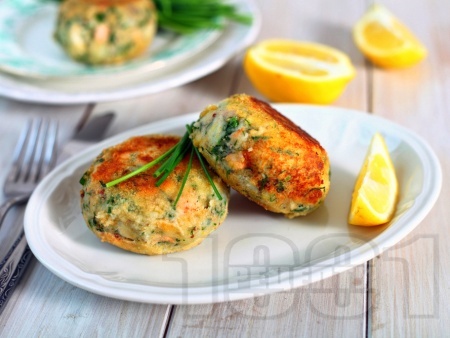 Рецепта:Сьомгата (200 г) се изпича на тиган или се приготвя на пара. Почиства се от кожата и ако има кости... |