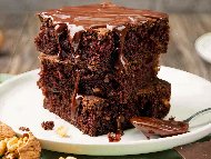 Кафяво брауни с глазура (с черен и млечен шоколад)Готовото брауни се залива с глазурата и се оставя леко да стегне. |