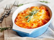 Картофена запеканка (огретен) с пушено пилешко месо, гъби и заквасена сметана на фурнаВ загрято олио се запържват нарязаните на ивици гъби и след това се добавят към картофите....Пече се около 15 минути в загрята фурна на 200 градуса. |