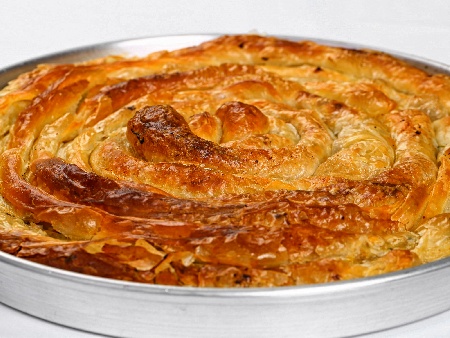 Пухкав турски бюрек / баница с готови точени кори, телешка кайма и праз лук на фурнаТелешката кайма и нарязаният праз лук се запържват....В намазнена тава на кръст се нареждат 4 кори за баница. |