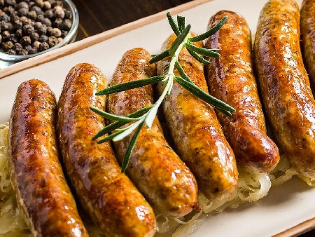 Ирландска закуска с наденички, яйца, гъби и царевицаНаденичките се изпичат на скара. |