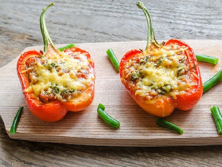Чушки / пиперки бюрек от печени чушки пълнени с извара и яйца в тава на фурнаРедят се в намазана с олио тавичка и се пекат на умерена фурна за 15 минути. |