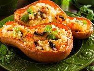 Пълнена печена тиква с кускус и гъби на фурнаТиквата се пълни с плънката и се връща във фурната....Щом омекнат се добавят нарязаните на ивици гъби и се задушават за кратко. |