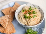 Веган разядка хумус Баба Гануш с патладжан, чесън, тахан и магданозПатладжаните се разрязват на половинки и леко се намазват със зехтин... |