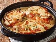 Лесни крехки свински вратни пържоли с бял сос от пресни гъби, мляко и масло печени на фурнаСлагат във фурната и се пекат на 180 градуса за 45 минути....В същия тиган се запържват гъбите за 10 минути, докато омекнат. |